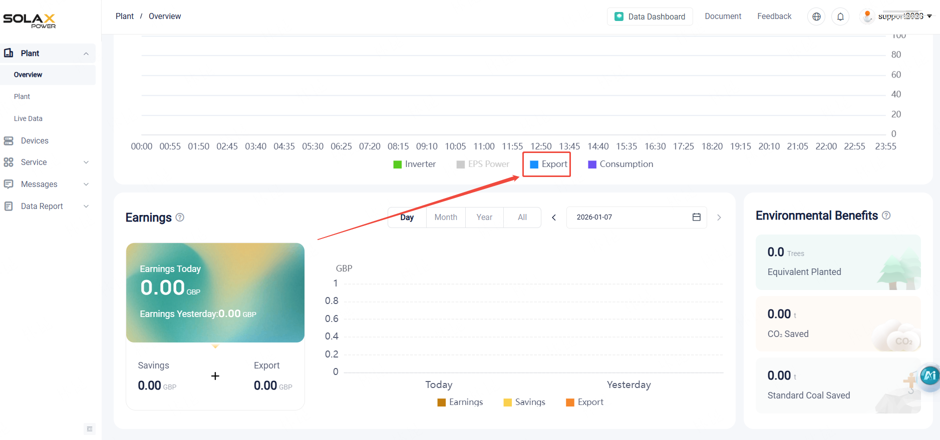 After you login your account, you can see the export value based on Plant Overview page, if the value is positive, it means your system is selling power to the grid, if the value is negative, it means your system is pulling power from the grid