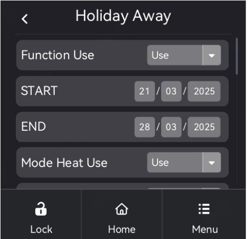 Setting path: Set Menu > Holiday Mode Settings > Holiday away