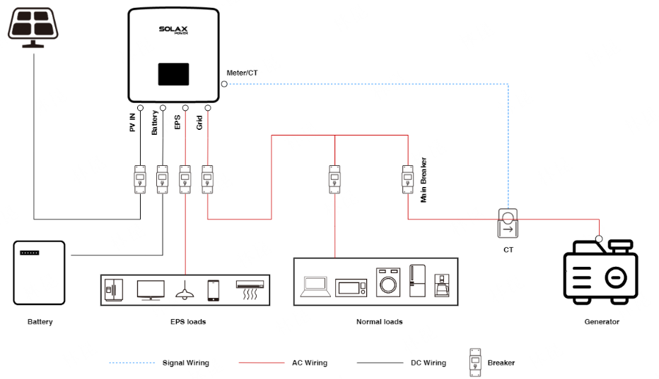 Note 1: Please note that there is no grid and no communication between the inverter and the generator. This case will be applied to a pure off-grid scene when end-user needs normal loads running or all load power is beyond EPS rated power.
